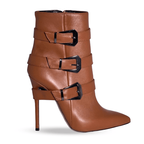 Stiefelette aus echtem Leder mit spitzer Zehenpartie, 3 seitlichen Schnallen und 100 mm oder 120 mm Stilettoabsatz