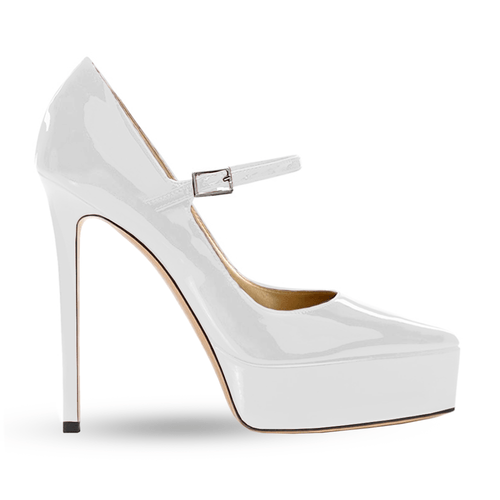 Pointed patent leather pumps with adjustable strap, 3.5cm platform and 13cm heel