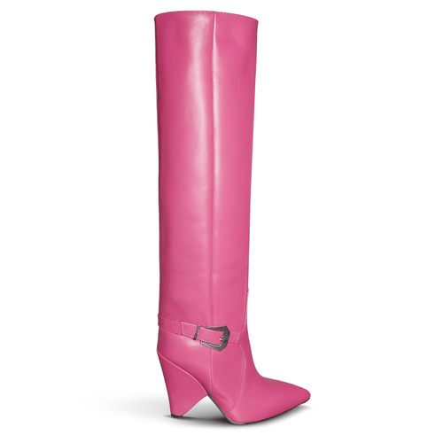 Tubular boot with pointed toe in genuine leather with strap and buckle, medium cone heel of 90mm