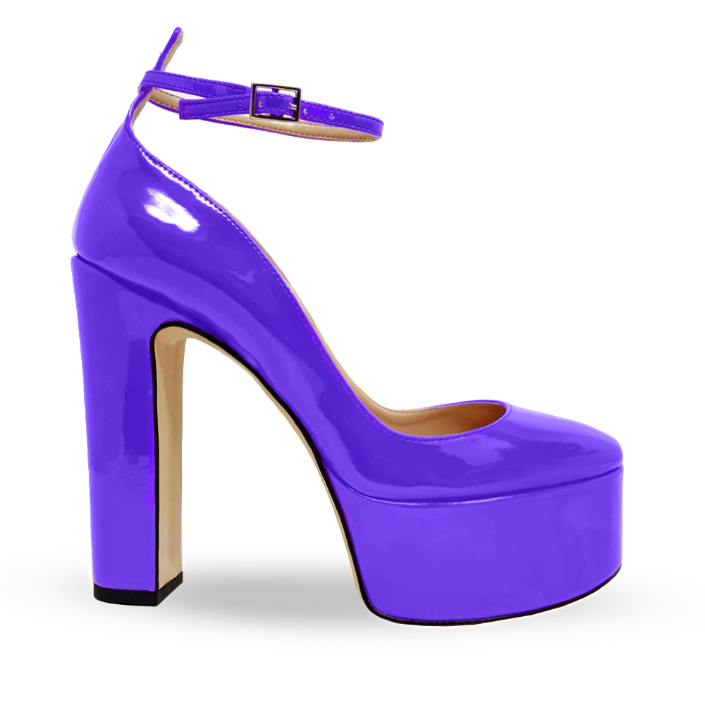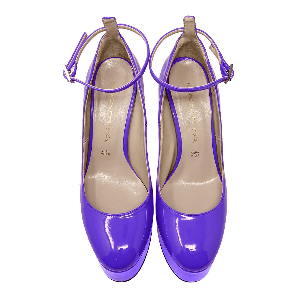 Round toe décolleté in patent leather, 4cm platform ankle strap and 13cm heel